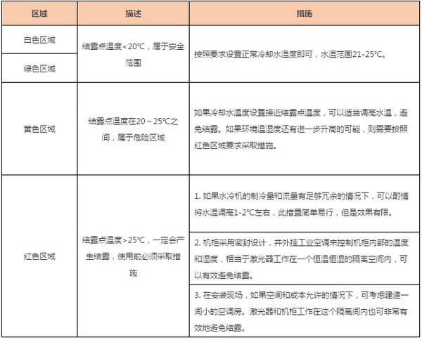 夏季是個悶熱的季節(jié),不僅氣溫高,空氣的濕度也高,在如此高溫高濕的環(huán)境下,光纖激光切割機冷卻水的溫度必須設置恰當,如果光纖激光切割機冷卻水溫度設置低于下表中對應的結露點溫度時,則會發(fā)生激光器結露的風險。